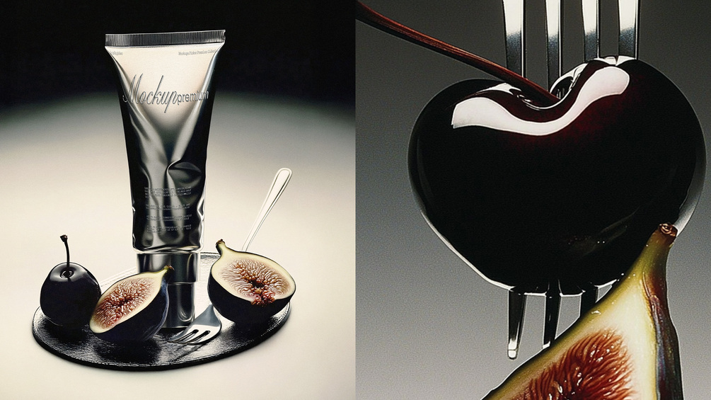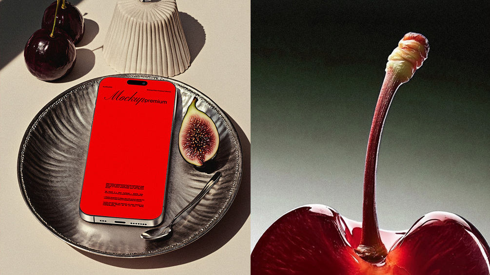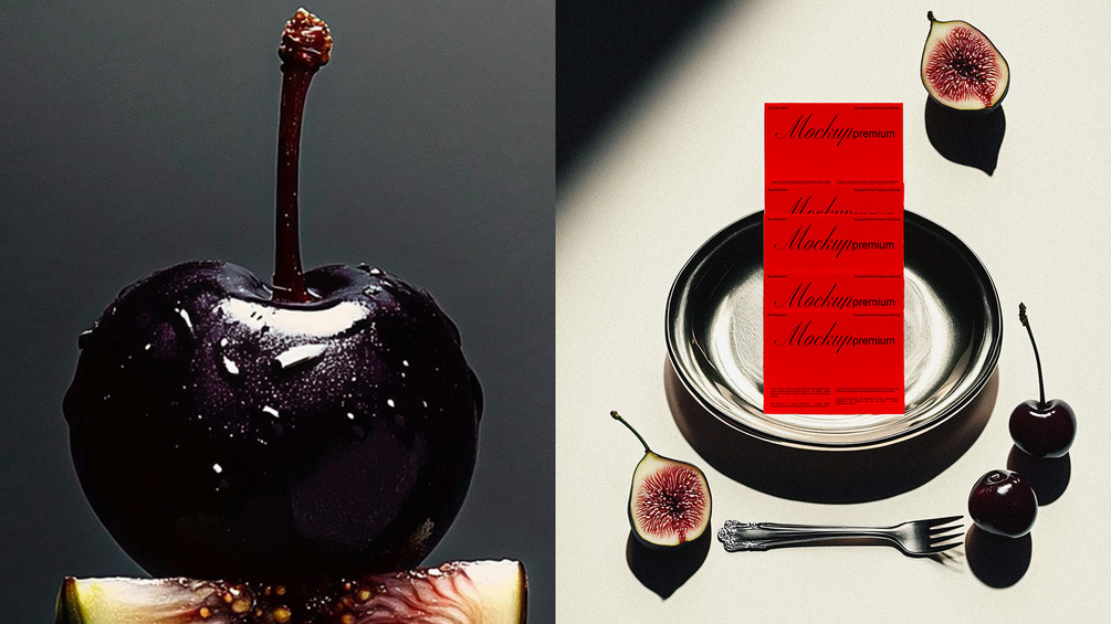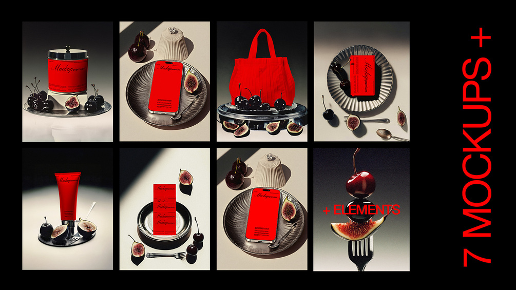 This set includes 7 high-end mockups merging luxury food styling with graphic design minimalism. Think glossy cherries, sliced figs, soft gradients, metal cutlery, and fashion editorial lighting — all curated into abstract tabletop scenes.